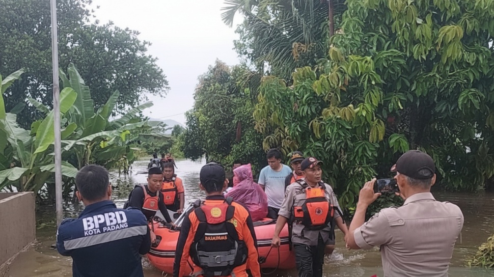 Situasi banjir Padang yang mengisolasi kawasan tersebut memaksa petugas menyiapkan perlengkapan keselamatan penuh untuk menembus lokasi.