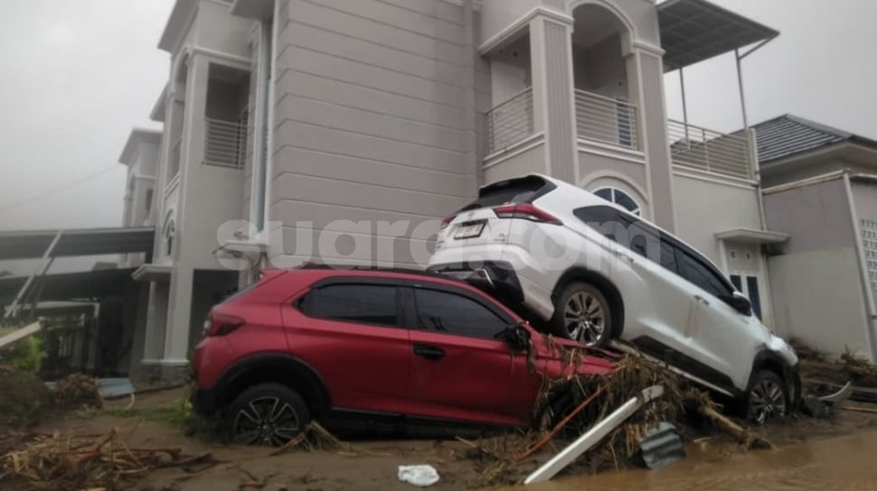 Pantauan SuaraSumbar.id pada Kamis (27/11) sore, material banjir bandang berupa lumpur, pasir dan kayu-kayu memenuhi area perumahan. Banyak kendaraan tertimbun dan menumpuk.